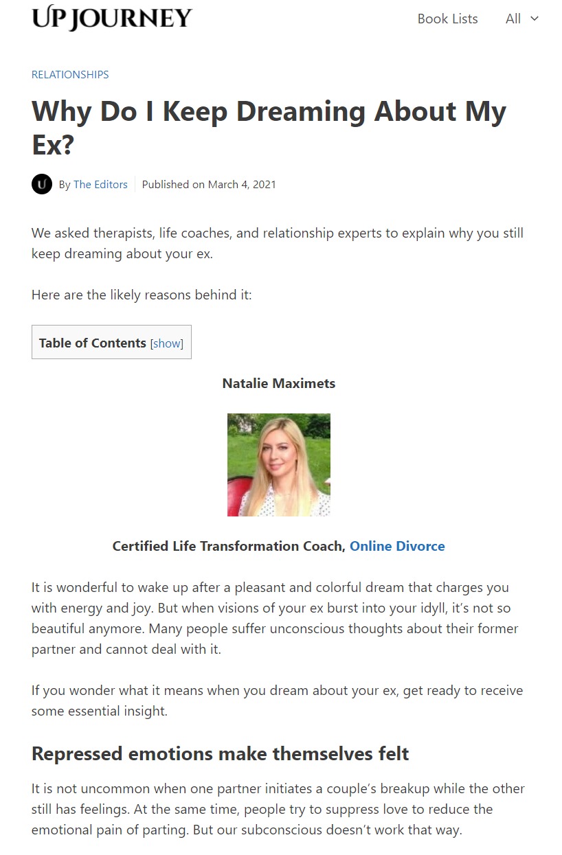 Why Do I Keep Dreaming About My Ex_ (According to Experts) – upjourney.com Post-breakup tips from Natalie Maximets, Life Transformation Coach, on Upjourney
